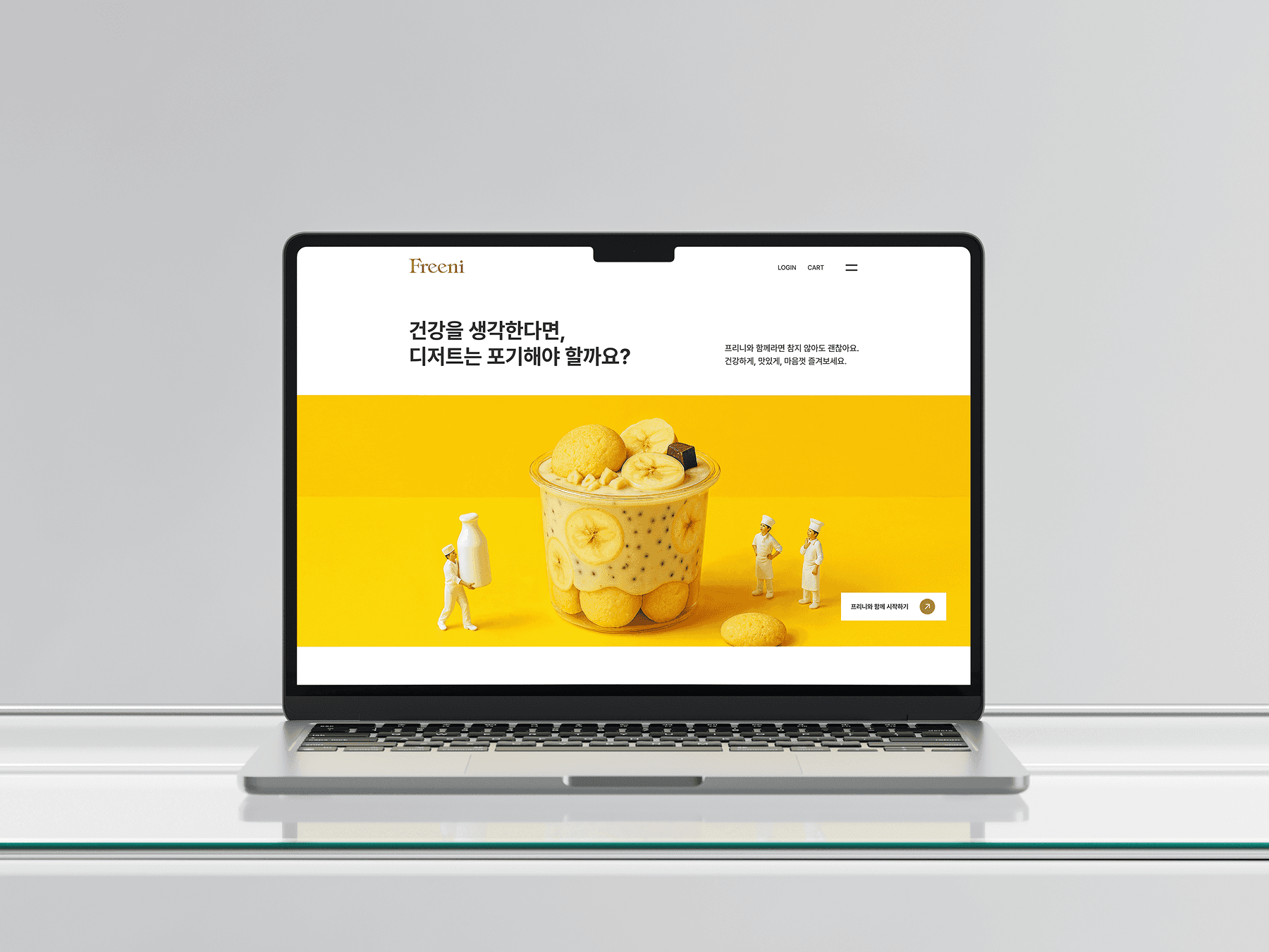 프리니(Freeni)는 저당, 고단백의 파우더로 다양한 건강 간식을 만들어 즐기는 디저트 브랜드입니다. 밝고 따뜻한 옐로우 톤을 사용하여