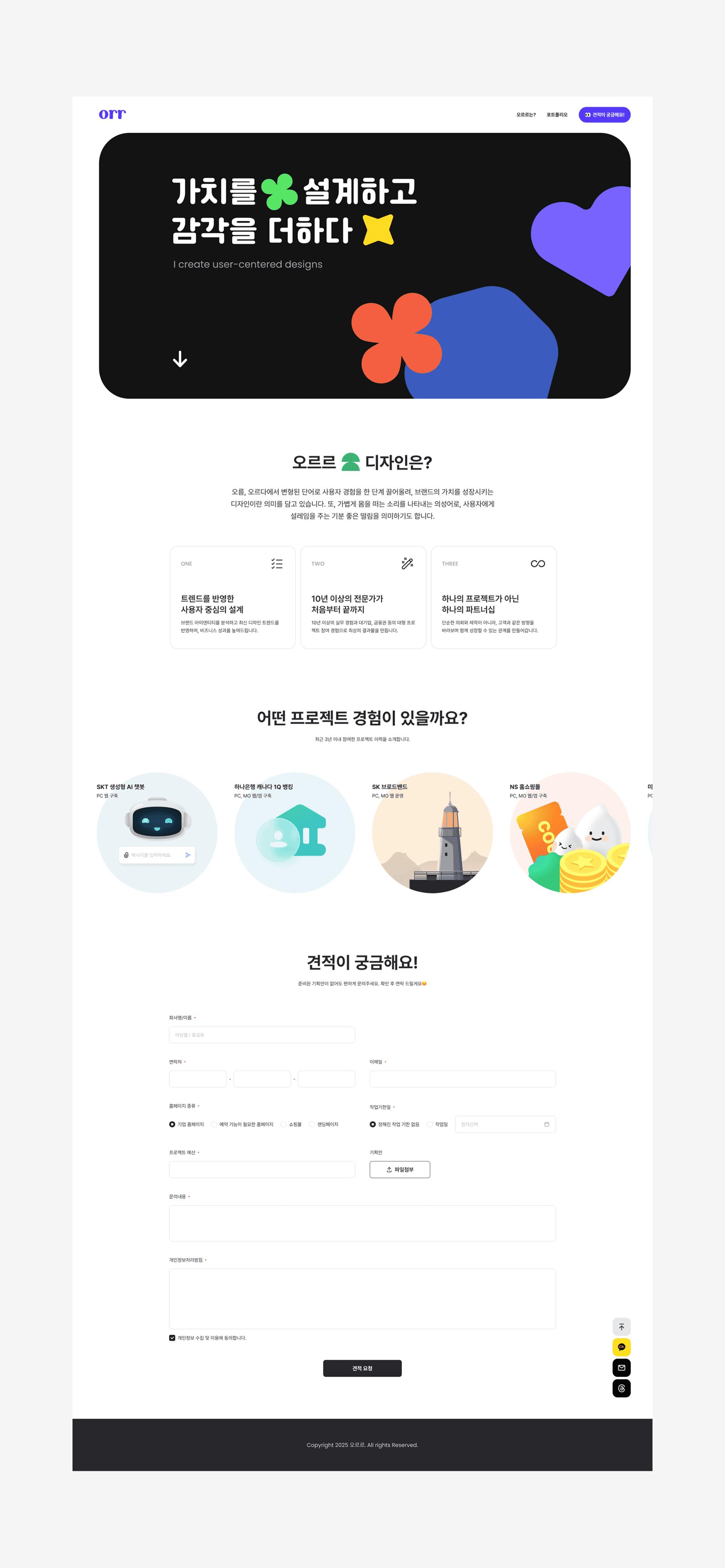 '가치를 설계하고 감각을 더하다'라는 슬로건을 강조하고 오르르디자인의 브랜드 이미지를 각인 시키기 위한 컨셉으로 제작하였습니다.